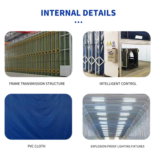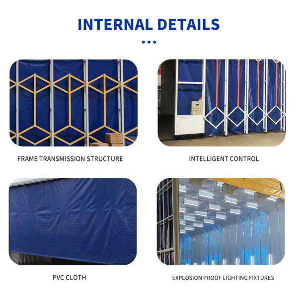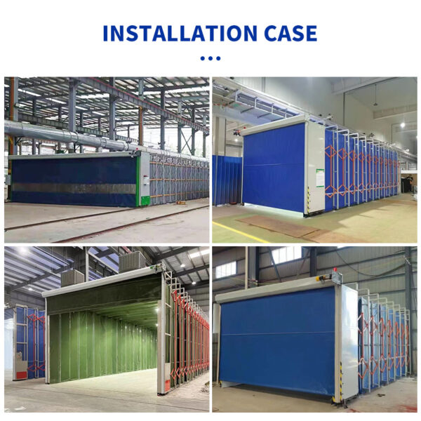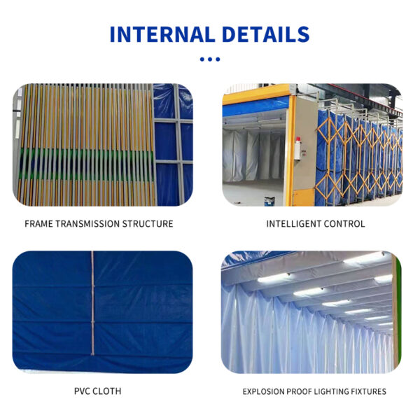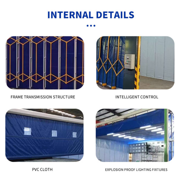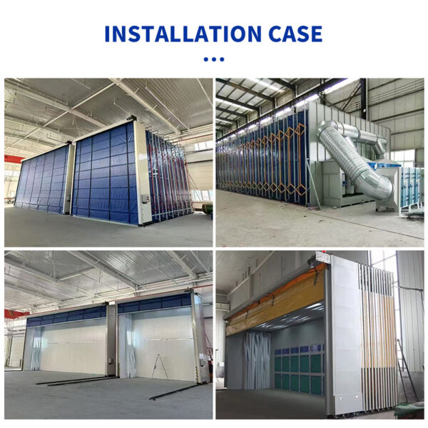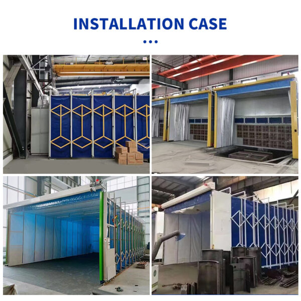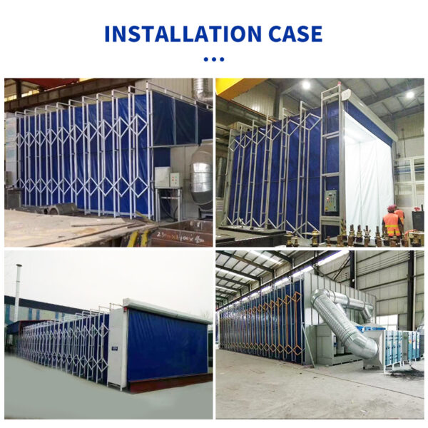 The Retractable Spray Booth is an innovative movable painting enclosure ideal for workshops and manufacturing plants with varying workpiece sizes. Built with a foldable steel frame and durable flame-retardant PVC curtains, it can easily extend or retract to adapt to different working areas, optimizing space utilization.