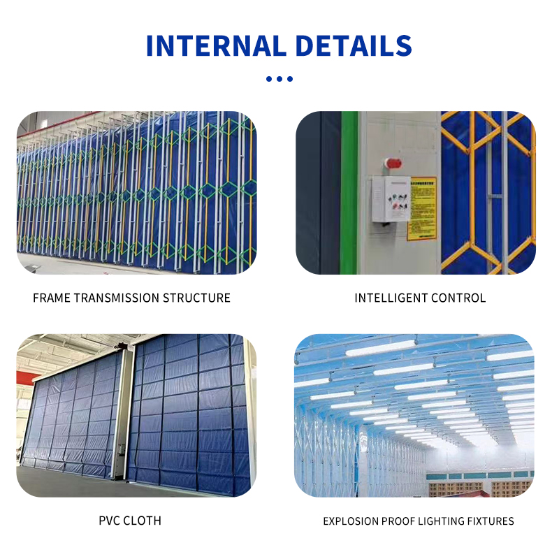 The Retractable Spray Booth is an innovative movable painting enclosure ideal for workshops and manufacturing plants with varying workpiece sizes. Built with a foldable steel frame and durable flame-retardant PVC curtains, it can easily extend or retract to adapt to different working areas, optimizing space utilization.
